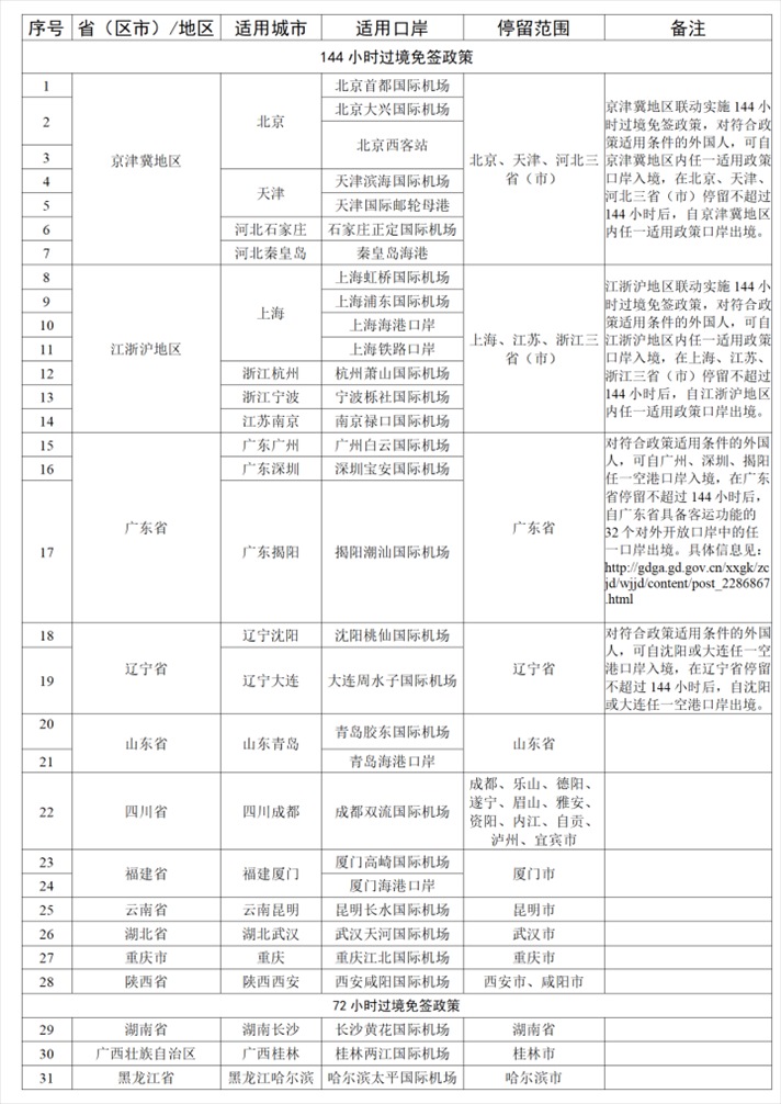 如外國(guó)人符合上述條件,可向我國(guó)20個(gè)城市的邊檢機(jī)關(guān)提出辦理144小時(shí)過境免簽申請(qǐng),或向3個(gè)城市的邊檢機(jī)關(guān)提出辦理72小時(shí)過境免簽申請(qǐng),其他城市暫未實(shí)施該項(xiàng)政策。