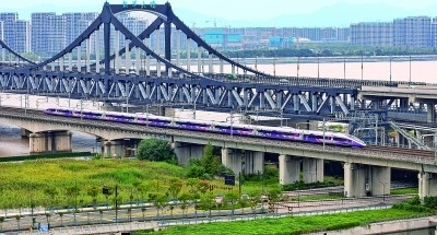 10月3日,亞運(yùn)涂裝復(fù)興號智能動車組從杭州東站發(fā)出,穿過錢塘江。本報(bào)記者 陳城攝/光明圖片