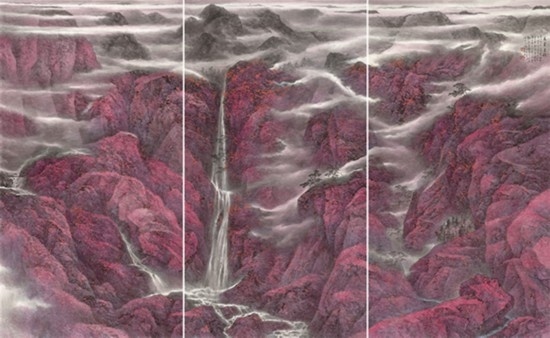 且看樂震文的《直上浮云》《云卷云舒》和《黃土馳風(fēng),日月星辰》,那逶迤茫茫的群山峻嶺,那縱橫畫面的云蒸霞蔚,那連綿不絕的箭樓城堞,哪里還是傳統(tǒng)文人山水畫的淡煙輕嵐,縹緲冷逸?濃縮于畫內(nèi)的精神意蘊(yùn),分明凸顯了現(xiàn)代山水畫對家國情懷的抒發(fā)。且讀張弛的《云起疊嶂》《惟余莽莽》和《紫氣氤氳》,那天光紫氣的浩渺煙云,那渾然一體的山水氣象,那千回百轉(zhuǎn)的流水飛泉,其實(shí)早已脫離了對自然山水的寫照,而是她感悟的時(shí)代精神在偌大畫面上的縱橫揮寫、主觀臆造。