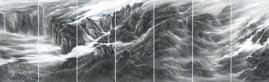 來自上海并深受海派畫學(xué)影響的樂震文、張弛,在宋元及明清山水畫學(xué)上打下了深厚的功底,也因此,他們的傳統(tǒng)山水畫深受日本民眾的歡迎。他們曾游居?xùn)|瀛多年,轉(zhuǎn)道再度研習(xí)了中國傳統(tǒng)文人畫。但真正改變他們畫風(fēng)的,卻是他們對中國北方大山大水的寫生攬勝。他們鐘情于英雄的太行山,忘情于革命勝地陜北高原,力求通過壯闊雄渾的山巒、連綿逶迤的群峰來表達(dá)他們的時(shí)代感悟,營構(gòu)儲(chǔ)存于他們胸中的山川氣象。所謂“山河回聲”,正是這些作品抒發(fā)的中華民族歷經(jīng)歲月風(fēng)華在大好河山之中回響的奮斗激情。