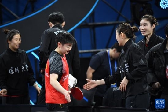 12月22日,深圳大學隊選手孫穎莎(左三)在女團半決賽獲勝后與隊友陳夢(右二)擊掌。她以3比0戰(zhàn)勝華東理工大學隊選手趙尚。最終深圳大學隊以總比分3比1戰(zhàn)勝華東理工大學隊。新華社記者 梁旭 攝