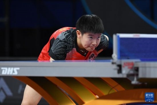12月22日,深圳大學隊選手孫穎莎在女團半決賽中等待對方發(fā)球。她以3比0戰(zhàn)勝華東理工大學隊選手趙尚。最終深圳大學隊以總比分3比1戰(zhàn)勝華東理工大學隊。新華社記者 梁旭 攝