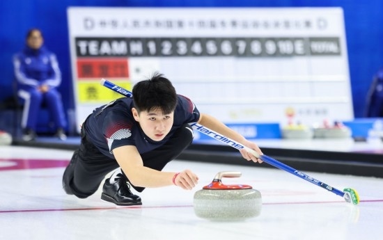 ??1月9日,內(nèi)蒙古隊(duì)選手李楊在混雙第一輪比賽中擲壺。最終,內(nèi)蒙古組合李楊/渠偌萱6:7不敵山西組合齊珈銘/張楚楚。新華社記者 王楷焱 攝