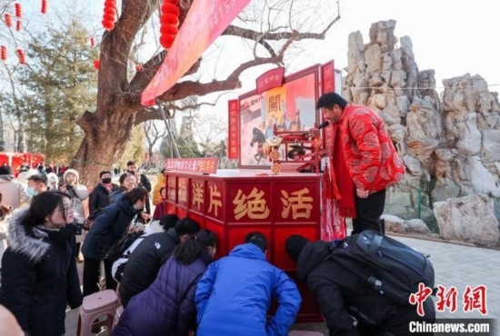 2月10日,大年初一,第三十八屆龍?zhí)洞汗?jié)文化廟會(huì)在北京龍?zhí)豆珗@開(kāi)門(mén)迎客。圖為市民和游客在廟會(huì)上觀(guān)看老北京絕活“拉洋片”。中新社記者 賈天勇 攝