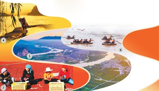 圖④:一名筏工背著羊皮筏子前行。圖⑤:黃河岸邊的龍灣村。圖⑥:游客們在龍灣村附近乘坐羊皮筏子。圖⑦:龍灣村村民喜迎紅棗豐收。圖均為宋朝軍、俞寶榮攝影報(bào)道