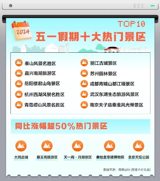 與去年五一相比,大同古城、滕王閣旅游區(qū)、天一閣·月湖景區(qū)、秦始皇帝陵博物院、北京天壇公園等景區(qū)今年打車需求火熱,同比上漲均超過(guò)50%,其中大同古城的打車需求同比漲幅為114%。