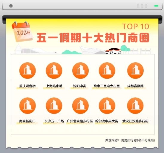 承載了“逛吃玩”需求一體的大型商圈也是五一出行的熱門。假期前往大型商圈的用車需求環(huán)比上漲118%。從打車需求來(lái)看,重慶觀音橋、上海陸家嘴、沈陽(yáng)中街等成為今年五一十大熱門商圈。其中前往重慶觀音橋、長(zhǎng)沙五一廣場(chǎng)的用車需求同比上漲均超50%。