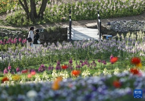5月11日,游客在大連英歌石植物園游覽拍照。