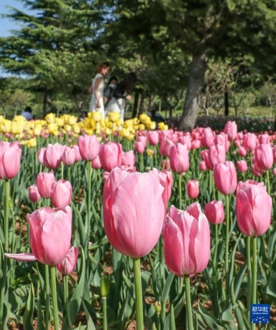 5月11日,游客在大連英歌石植物園游覽(無人機照片)。