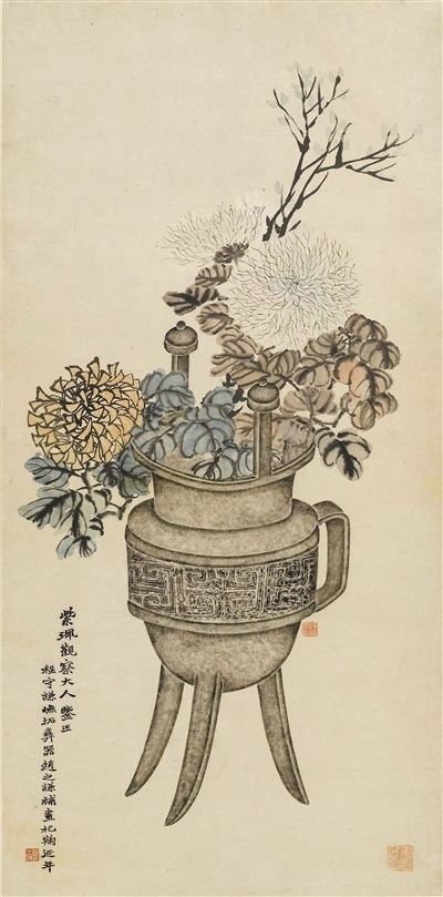 圖為清代趙之謙、程守謙中國(guó)畫(huà)《菊花博古圖軸》,上海博物館藏。
