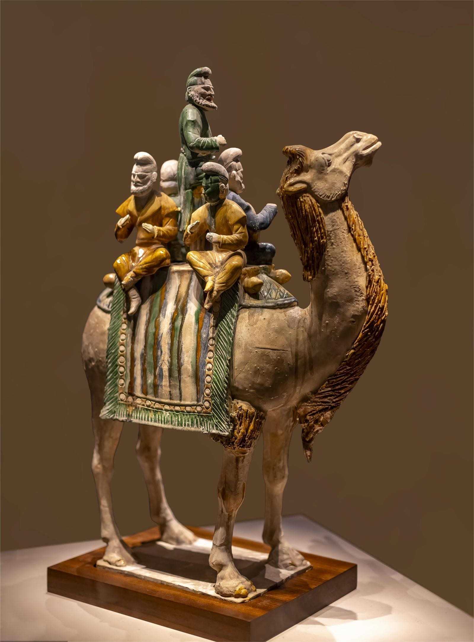 中國(guó)國(guó)家博物館的唐三彩釉陶載樂(lè)駱駝巧妙地夸張了人與駝的比例,造型優(yōu)美生動(dòng),釉色鮮明潤(rùn)澤,代表了唐三彩的最高水平,更重要的是,它見(jiàn)證了絲綢之路上的文明互鑒。