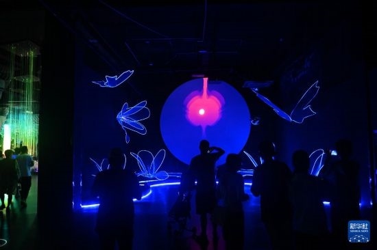7月5日,游客在杭州宋城景區(qū)觀看光影互動(dòng)。