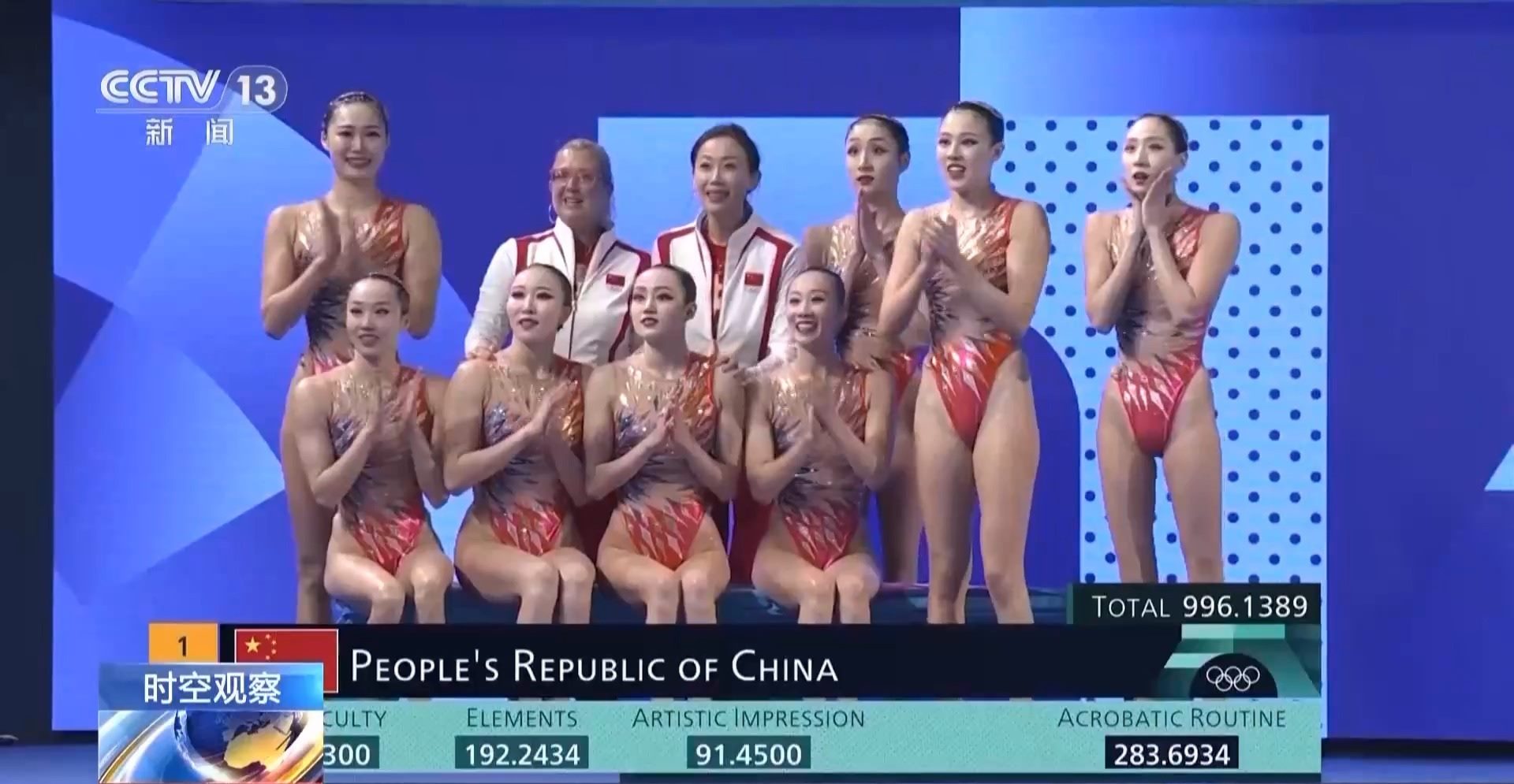 996.1389分!中國花游姑娘們以三場比賽穩(wěn)居第一的優(yōu)異表現(xiàn),贏得了中國花游在奧運會上奪得的首枚金牌。