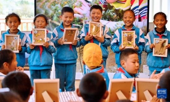 8月15日,拉魯小學(xué)的學(xué)生在拉魯濕地國家級自然保護區(qū)管理局科普小教室里向大家展示優(yōu)秀植物標(biāo)本。
