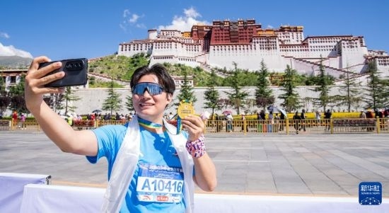 8月17日,參賽選手完賽后在布達拉宮前手舉獎牌拍照留念。
