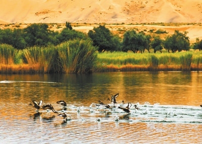 鳥兒在巴丹吉林沙漠中的海子里嬉戲。內蒙古阿拉善右旗融媒體中心供圖