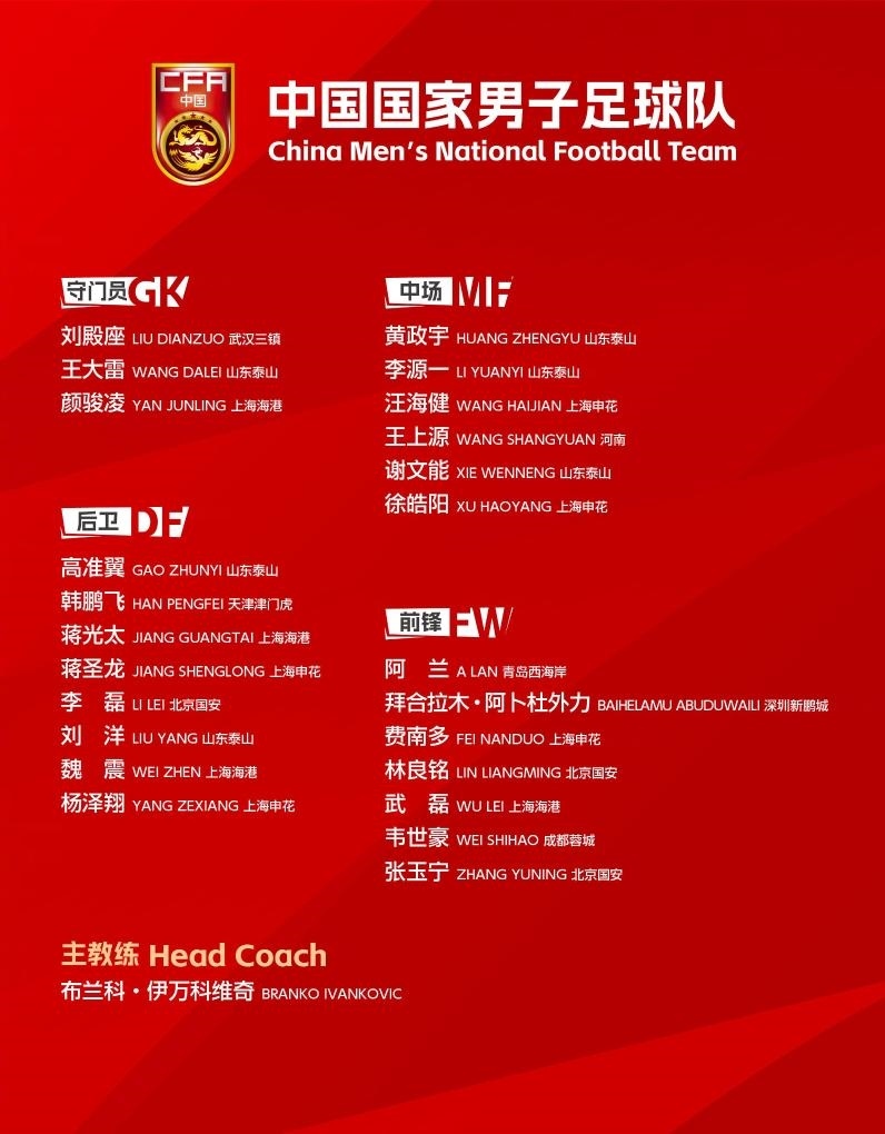 以下為24人大名單:武磊、顏駿凌、蔣光太、魏震(上海海港),王大雷、劉洋、高準(zhǔn)翼、黃政宇、謝文能、李源一(山東泰山),韋世豪(成都蓉城),費南多、蔣圣龍、徐皓陽、楊澤翔、汪海?。ㄉ虾I昊ǎ?,李磊、張玉寧、林良銘(北京國安),劉殿座(武漢三鎮(zhèn)),韓鵬飛(天津津門虎),王上源(河南),拜合拉木·阿卜杜外力(深圳新鵬城),阿蘭(青島西海岸)。