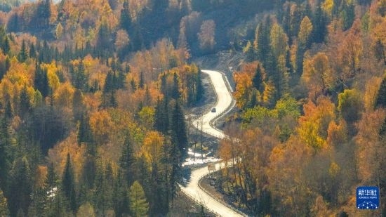 這是10月1日在新疆阿勒泰拍攝的阿禾公路沿途風(fēng)景(無人機(jī)照片)。