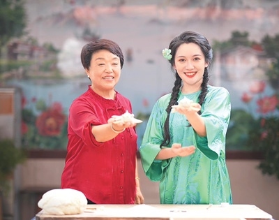 柳青瑤(右)身穿綠色老軟緞改良旗袍與煙臺(tái)市膠東花餑餑非遺傳承人曲麗榮錄制電視節(jié)目。本文配圖除標(biāo)注外均為受訪者供圖