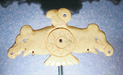 玉鷹是凌家灘文化最具代表性的器物之一。鷹側(cè)首傲視,雙翅張開,翅端各為一豬首形象,可能以豬作為財富的象征。鷹腹刻八角星紋,這種紋樣在凌家灘出土的玉版和新石器時代眾多陶器上都有出現(xiàn)。這件玉鷹可能是舉行祭祀儀式時所用之物,鷹、豬、八角星紋集于一器,體現(xiàn)了先民崇尚萬物有靈的宇宙觀。