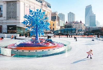 在哈爾濱市南崗區(qū)一處公益冰場(chǎng),人們?cè)凇氨┲凇钡袼芘曰?/p>