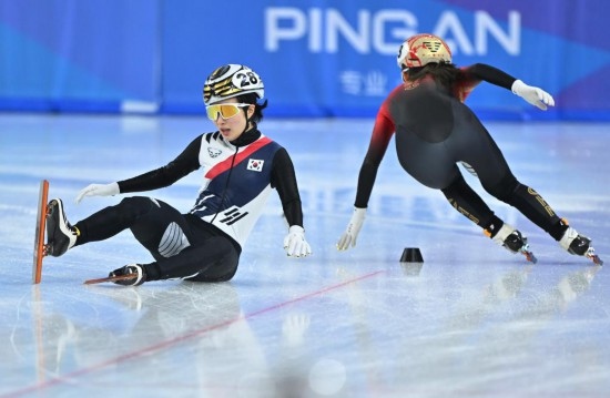 2月9日,中國隊(duì)選手林孝埈(右)、韓國隊(duì)選手樸智元在比賽中發(fā)生身體碰撞。新華社記者 顏麟蘊(yùn) 攝