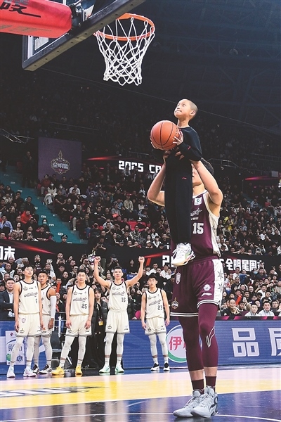 本屆全明星賽第二節(jié)最后的一次暫停時(shí),現(xiàn)場(chǎng)上演了溫情一幕:北區(qū)明星隊(duì)首發(fā)中鋒楊瀚森,舉起來自吉林省孤兒學(xué)校的小朋友趙路健,幫助他完成了一次扣籃。