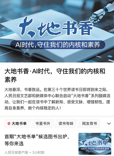 習(xí)近平總書記在今年全國(guó)兩會(huì)期間的重要講話中指出“書香是一種氛圍”“數(shù)字閱讀要和傳統(tǒng)閱讀結(jié)合起來,守住我們的內(nèi)核和素養(yǎng)”。在第三十個(gè)世界讀書日即將到來之際,人民日?qǐng)?bào)社文藝部和新媒體中心聯(lián)合啟動(dòng)“大地書香”系列融媒活動(dòng),并圍繞“AI時(shí)代,守住我們的內(nèi)核和素養(yǎng)”推出首期“大地書單”。來自出版、文藝、科技、教育等不同領(lǐng)域的20位薦書人,推薦出35本候選圖書,在人民日?qǐng)?bào)客戶端“大地書香”專題予以集中呈現(xiàn),參照網(wǎng)友的評(píng)論與推薦,最終推選出10本上榜圖書。讓我們多讀書、讀好書,一起在氤氳著書香的大地上行穩(wěn)致遠(yuǎn)。