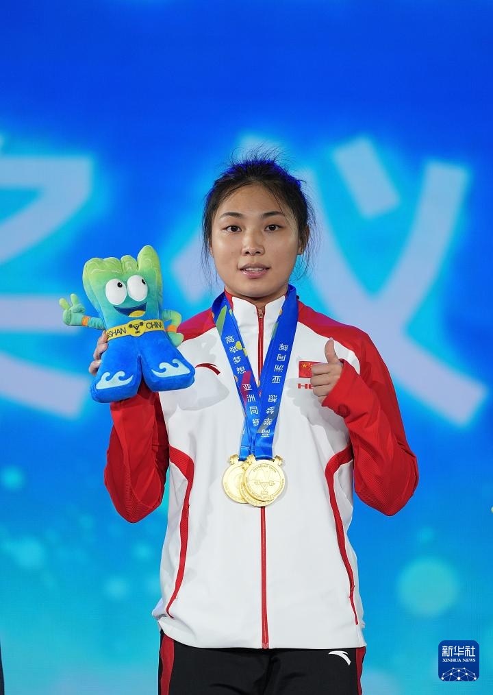 5月10日,中國選手張海琴在頒獎儀式上。最終,她獲得抓舉、挺舉、總成績?nèi)椆谲?,并打破這三項世界青年紀錄。新華社記者 侯昭康 攝